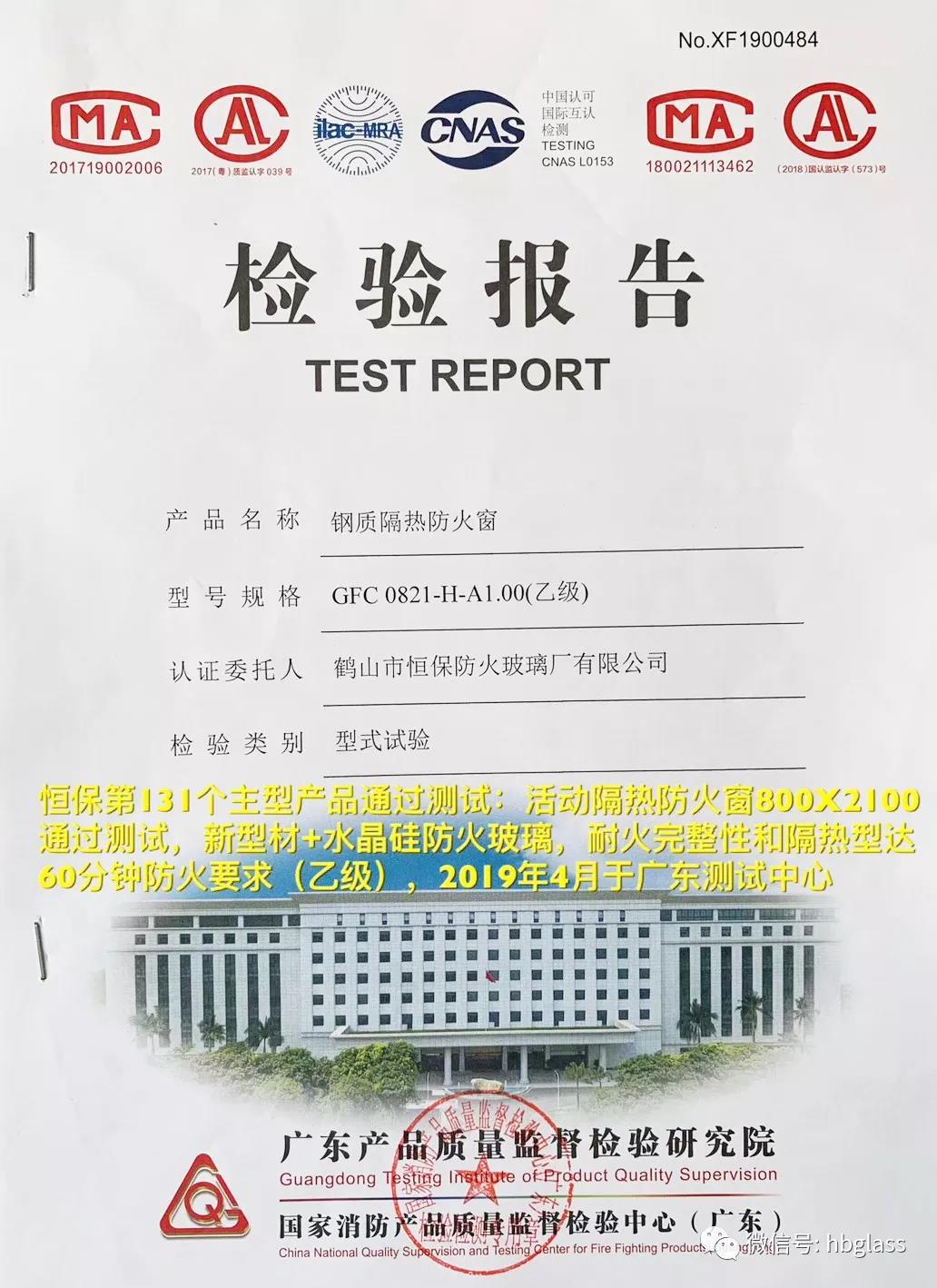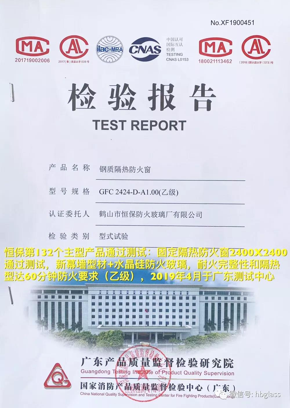 恒保第132個主型產(chǎn)品通過測試:2019年4月于廣東測試中心,恒保公司送檢的固定隔熱防火窗(2400X2400,新幕墻型材+福普思水晶硅防火玻璃),通過耐火完整性和隔熱型達(dá)60分鐘防火要求(乙級)測試要求,并獲得檢測合格報(bào)告。國家強(qiáng)制性CCC認(rèn)證證書正在申請中。