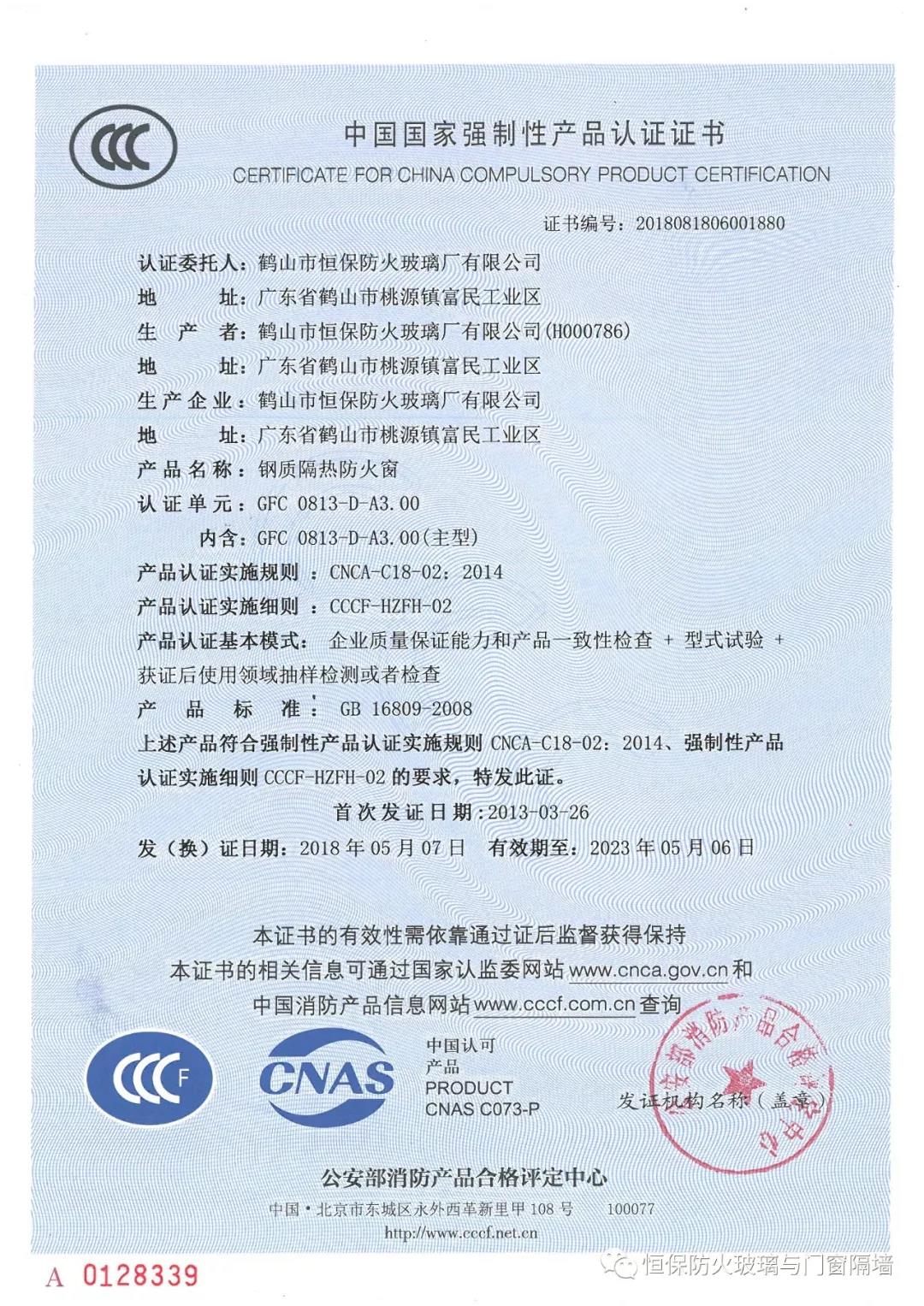 截止2018年10月,已獲得國家“CCCf”主型產(chǎn)品認(rèn)證證書36張,評(píng)定中心網(wǎng)上公告報(bào)告55份,四川中心公告26份,天津中心公告2份,英標(biāo)、歐標(biāo)、澳標(biāo)、美標(biāo)檢驗(yàn)報(bào)告35份評(píng)估報(bào)告20份,耐火窗等其他性能測(cè)試報(bào)告16份,恒保公司共獲報(bào)告154份涵蓋0.5小時(shí)至4小時(shí)防火系列產(chǎn)品,并擁有防火玻璃與門窗類專利21項(xiàng)。