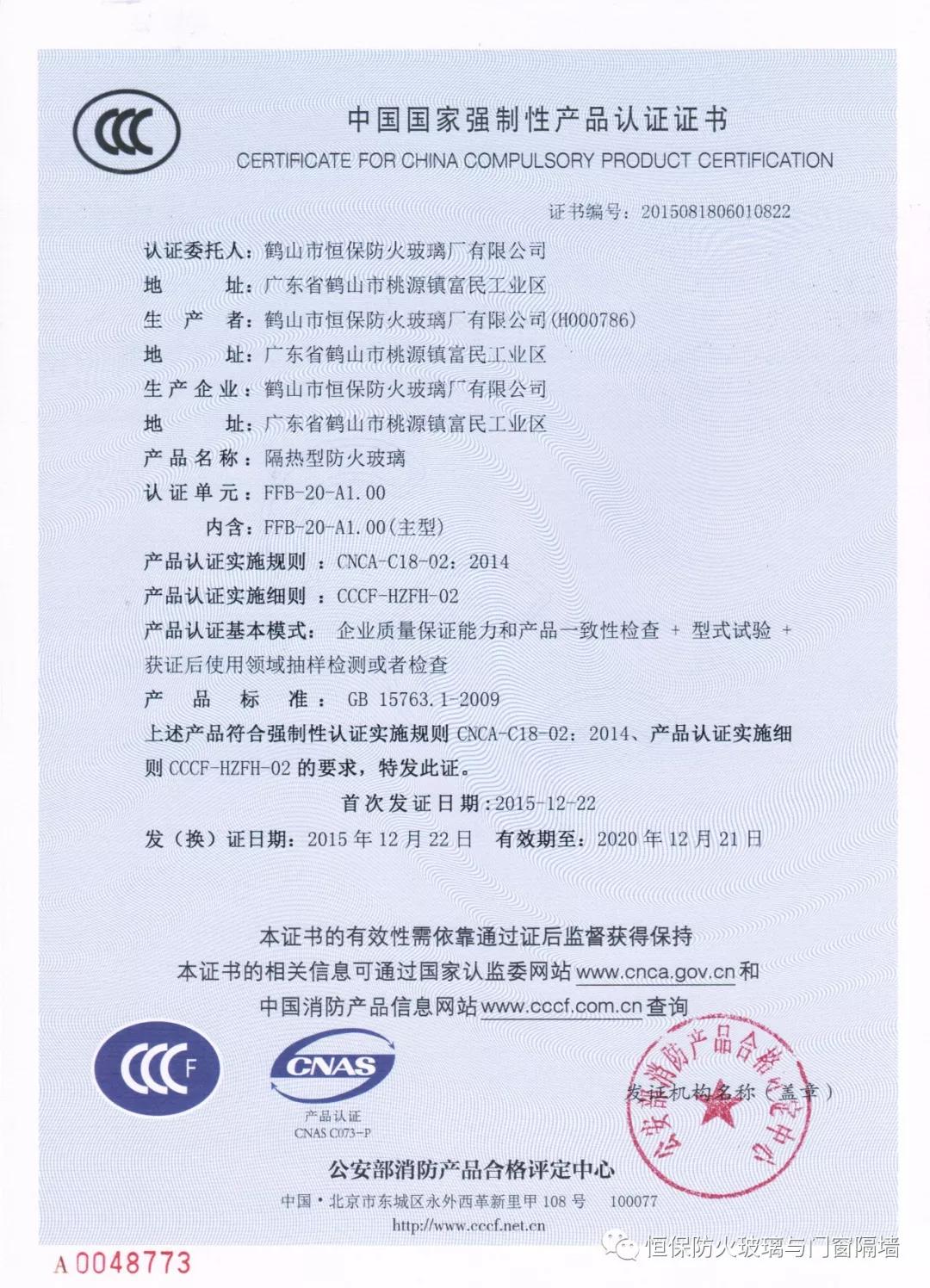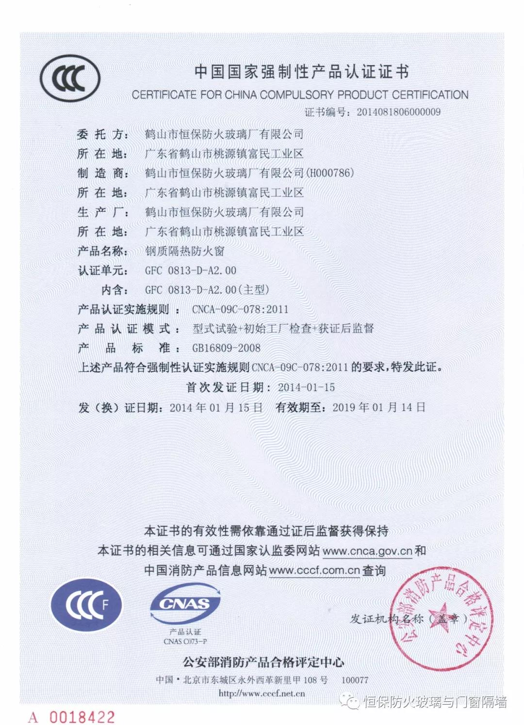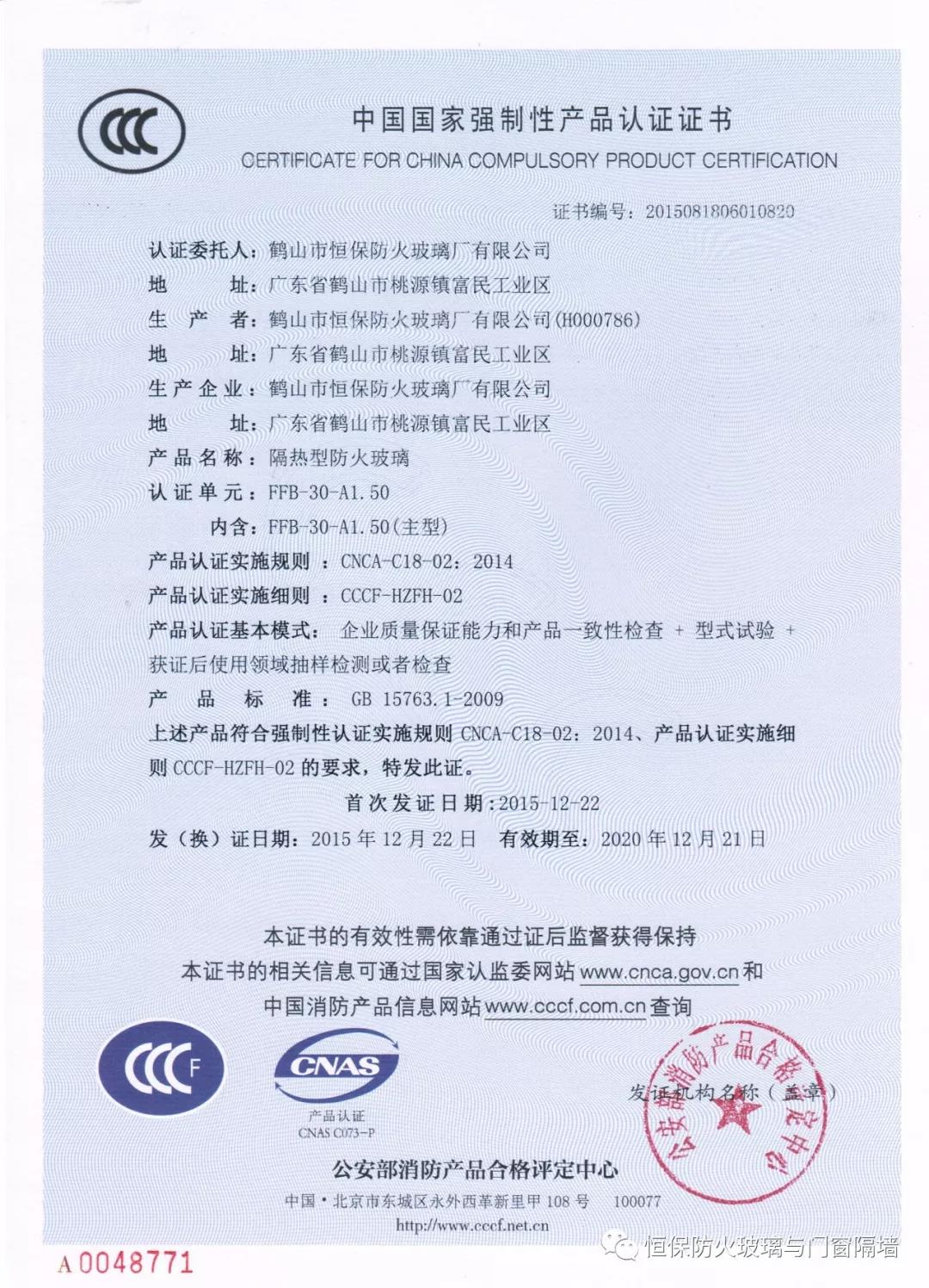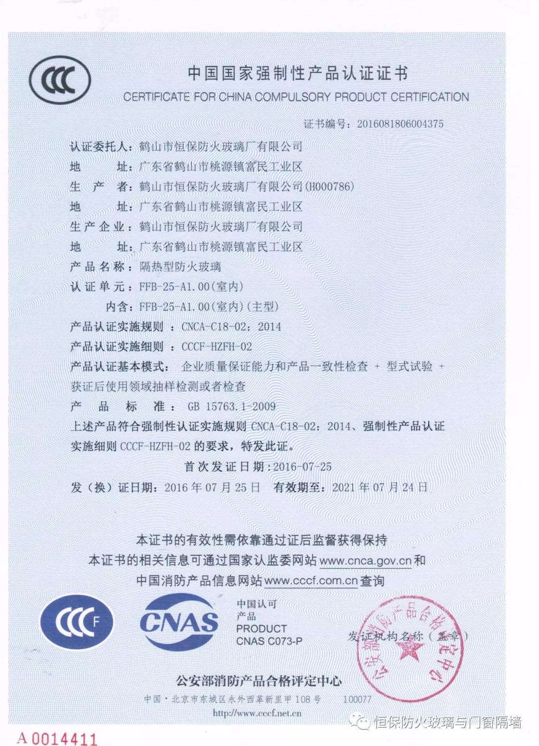 截至2017年7月,恒保已獲得國家“CCCf” 主型產(chǎn)品認證證書31張,評定中心網(wǎng)上公告報告51份,四川中心公告11份,英標、歐標、澳標、美標報告29份評估報告18份,耐火窗報告4份,共計113份涵蓋0.5小時至4小時防火玻璃系列產(chǎn)品,防火玻璃與門窗類專利17項。