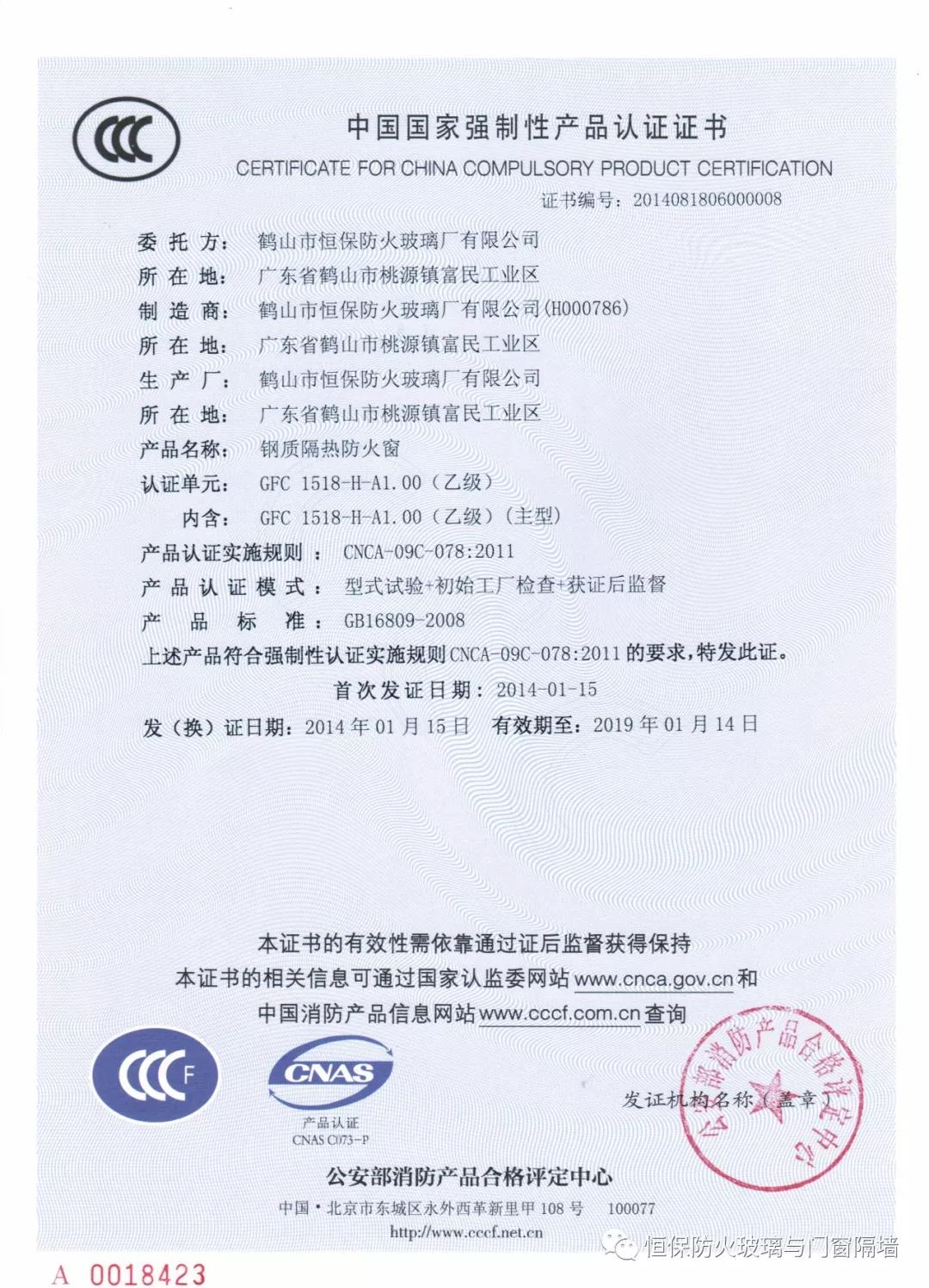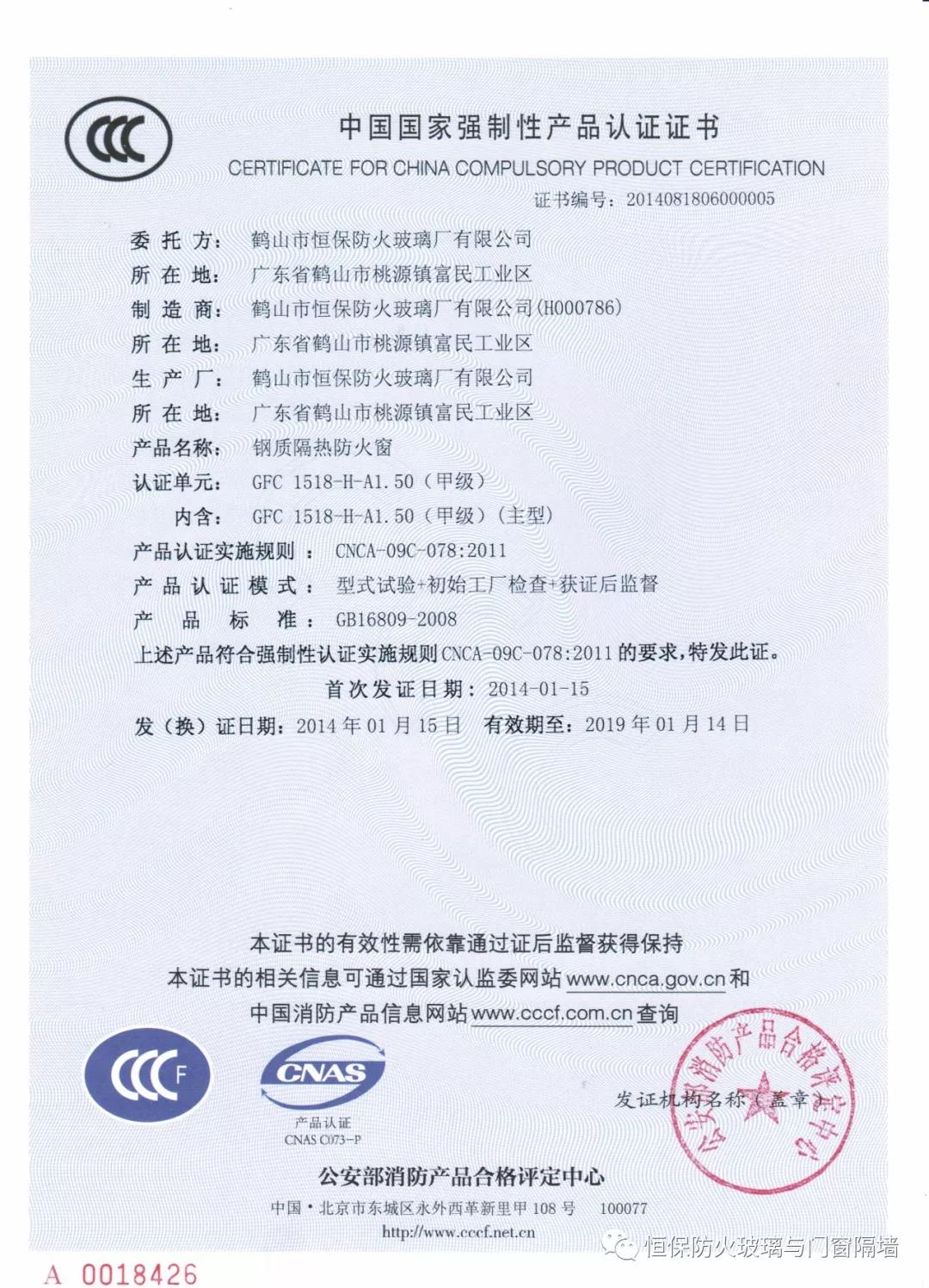 4.恒保公司一共12個產(chǎn)品獲得國家3C認證證書,2小時和3小時鋼質(zhì)隔熱防火窗更是國家首個通過國家認證的產(chǎn)品;
