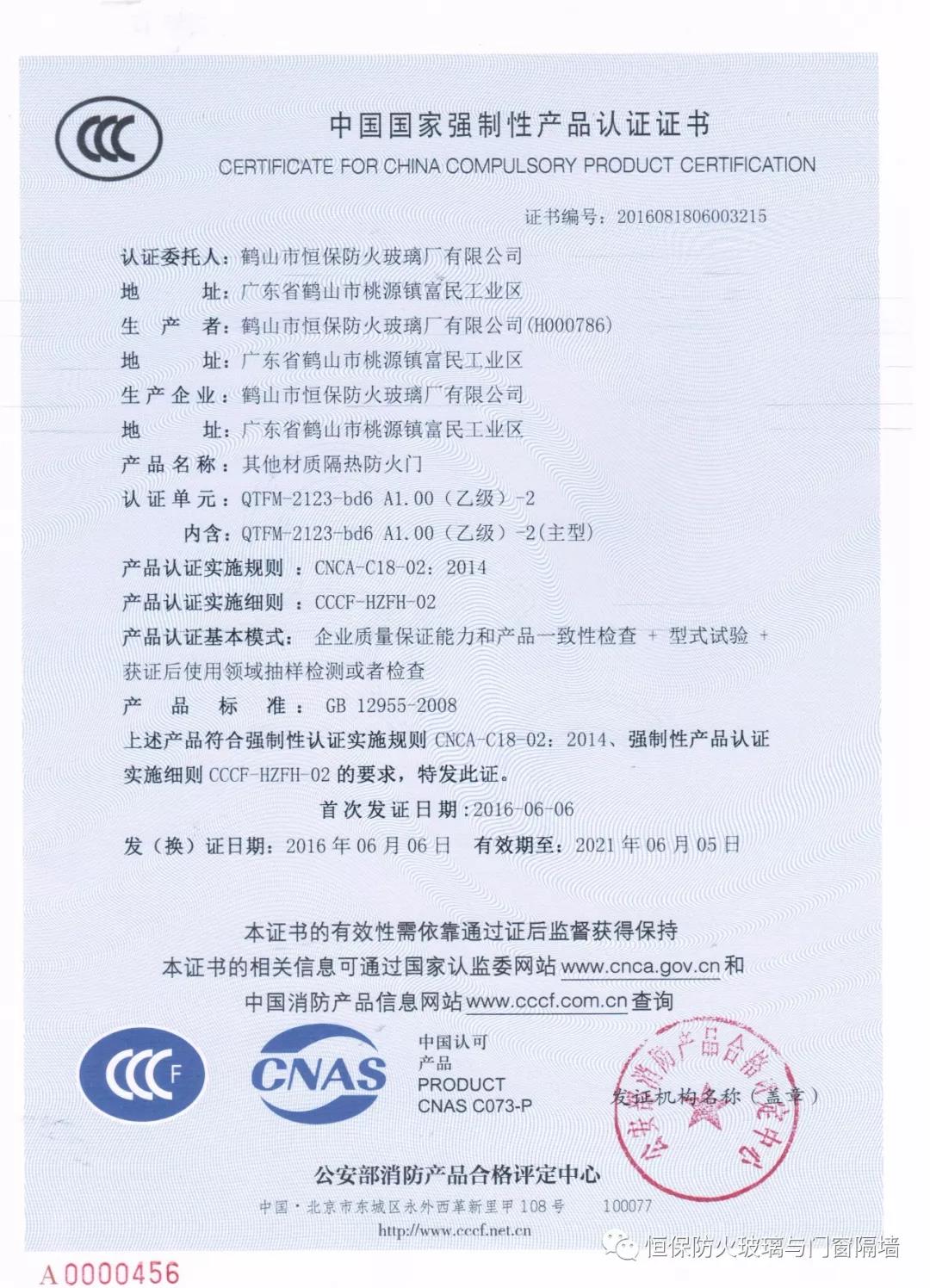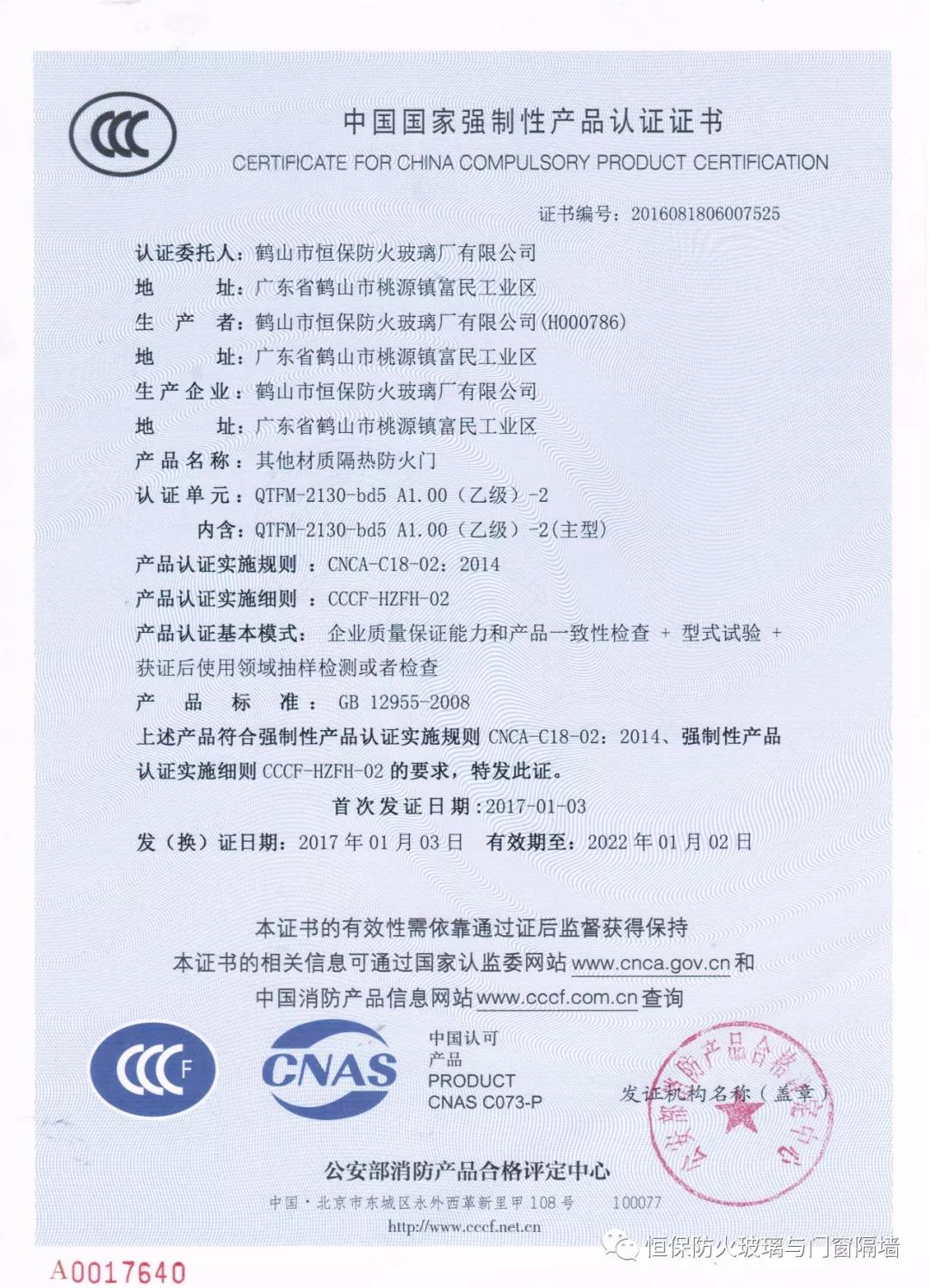 5、恒保公司一共6個產(chǎn)品獲得國家3C認證證書,其中大版面玻璃防火門2100mmX3000mm;