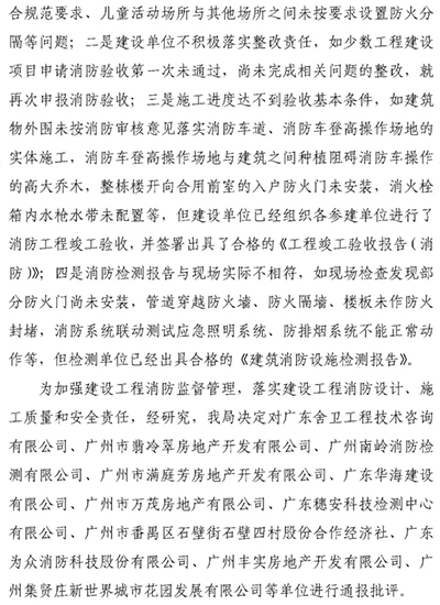 近期,廣州市住房和城鄉(xiāng)建設(shè)局在辦理建設(shè)工程消防設(shè)計審查驗收工作中發(fā)現(xiàn),大部分施工圖審查機構(gòu)、建設(shè)、設(shè)計、施工、監(jiān)理、檢測單位能夠嚴(yán)格執(zhí)行國家、地方消防技術(shù)標(biāo)準(zhǔn)規(guī)范,但也存在一些不容忽視的問題。存在的主要問題有: - 一是施工圖審查機構(gòu)未嚴(yán)格按照消防法律法規(guī)、消防技術(shù)標(biāo)準(zhǔn)規(guī)范和《建設(shè)工程消防設(shè)計審查規(guī)則》(GA1290-2016)開展消防設(shè)計文件審查,如已審查合格的部分工程仍存在對廠房的火災(zāi)危險性定性錯誤、消防車道設(shè)置不符合規(guī)范要求、兒童活動場所與其他場所之間未按要求設(shè)置防火分隔等問題。