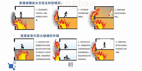 普通浮法玻璃遇火30秒炸裂,鋼化玻璃遇火1分鐘炸裂,不具備耐火完整性無法在一定時間內(nèi)阻擋火勢蔓延。而單片防火玻璃,遇火時在1000℃高溫下可堅持30—120分鐘不炸裂,有效地限制火災(zāi)以及煙霧波及的范圍。